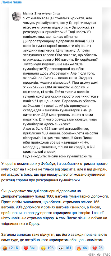 "У коментарях у Facebook і в особистих отримав просто купу скарг на Лисака не тільки від одеситів, але й від дніпрян, які згадують йому, що при ньому цілеспрямовано зупинився розгляд справи про розкрадання гуманітарки", — ідеться в дописі блогера.