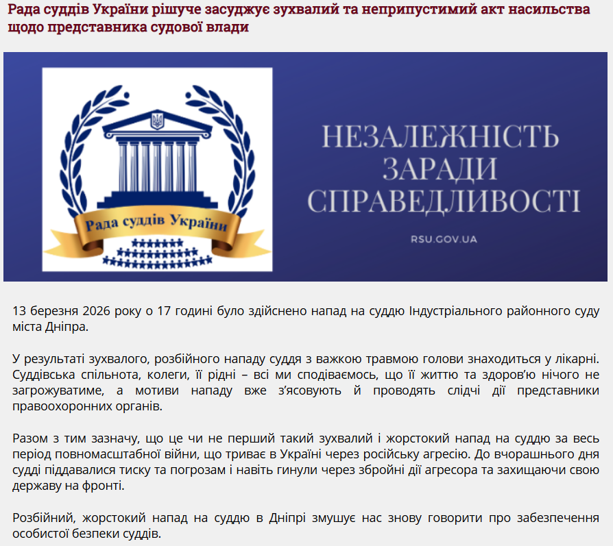 Рада суддів України інформує, що напад на суддю Індустріального районного суду міста Дніпра стався увечері в п'ятницю, 13 березня.