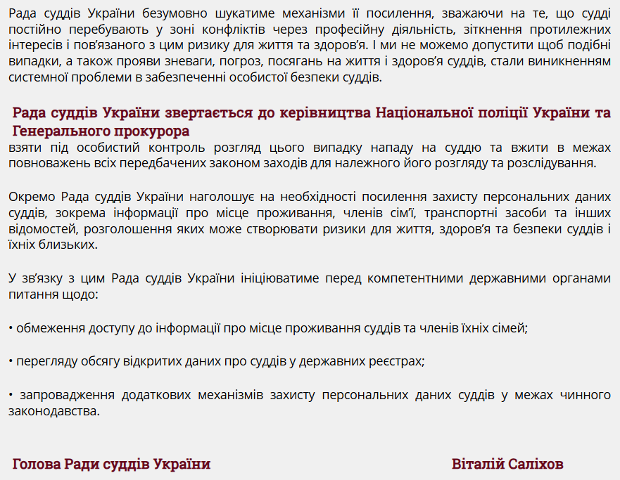 Рада суддів України звертається до керівництва Національної поліції України та Генерального прокурора взяти під особистий контроль розгляд цього випадку та вжити всіх передбачених законом заходів для належного його розгляду та розслідування.