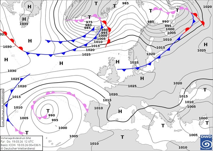 "Ось на карті прогнозу на завтра, 19-го березня, видно, наприклад, холодний фронт (синя лінія із "колючками"), шматочки теплих фронтів (червона лінія із півсферами) і фронт оклюзії (бузковий колір із "колючками" та півсферами одночасно, над Атлантикою)", — йдеться в публікації.