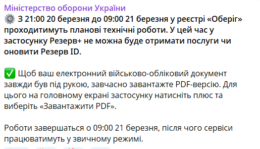 У Міноборони уточнили, що роботи завершаться о 09:00 21 березня, після чого сервіси працюватимуть у звичайному режимі.