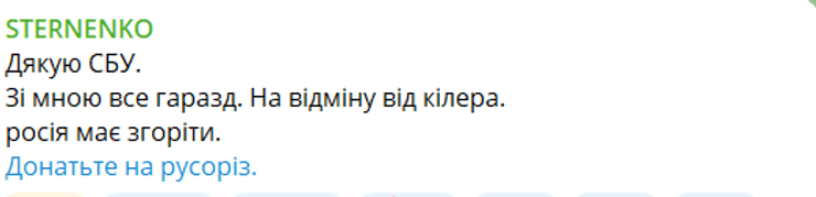 "Дякую СБУ. Зі мною все добре. На відміну від кілера. росія повинна згоріти", — написав він.