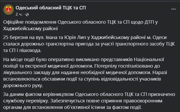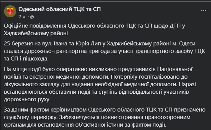 Одеський обласний ТЦК та СП оприлюднив офіційну інформацію щодо дорожньо-транспортної пригоди, яка сталася у Хаджибейському районі. Він повідомив, що 25 березня на вулиці Івана та Юрія Лип в Одесі зафіксували ДТП за участі автомобіля ТЦК та СП і пішохода.