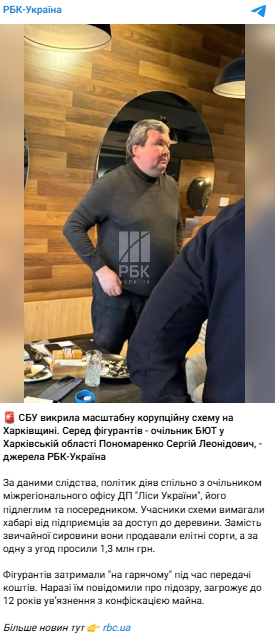 В Офісі генпрокурора уточнили, що затримано керівника "Слобожанського лісового офісу" ДП "Ліси України", директора Гутянського надлісництва і двох посередників. Ще один учасник — почесний консул іноземної держави в Харкові.