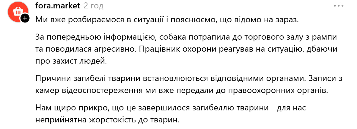Скриншот | реакція "Фори" на вбивство собаки