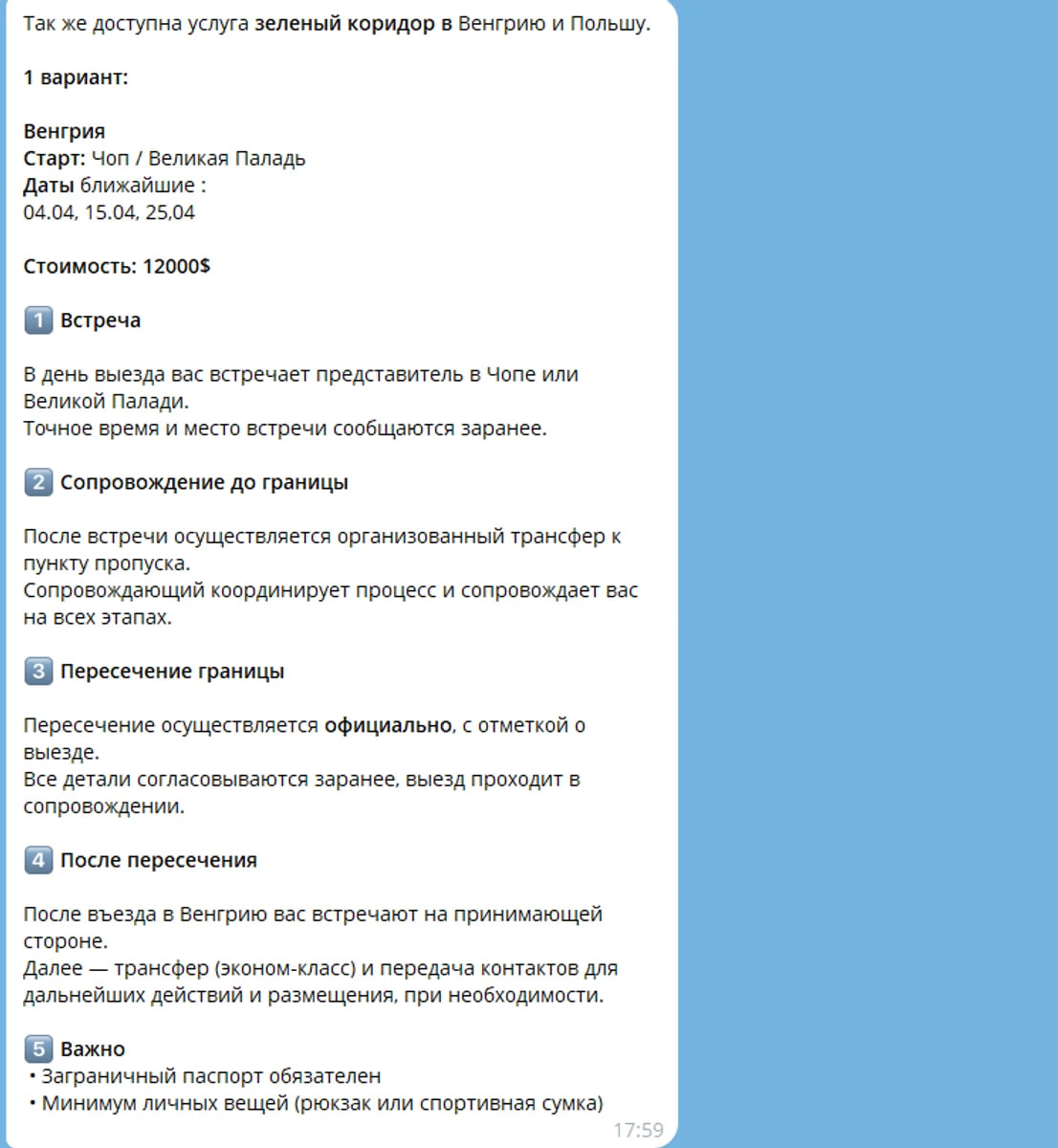Крім того, журналісти поспілкувалися посередником, який пропонують готові сценарії уникнення мобілізації. Що цікаво, контакти цього чоловіка видання знайшло через тематичний допис у Threads. Зокрема, черед "сценаріїв" пропонується — незаконний виїзд за кордон або оформлення "пожиттєвого" виключення з військового обліку. В цілому, такі послуги можуть коштувати від 9 до 12 тисяч доларів, а розрахунки нерідко здійснюються у криптовалюті.