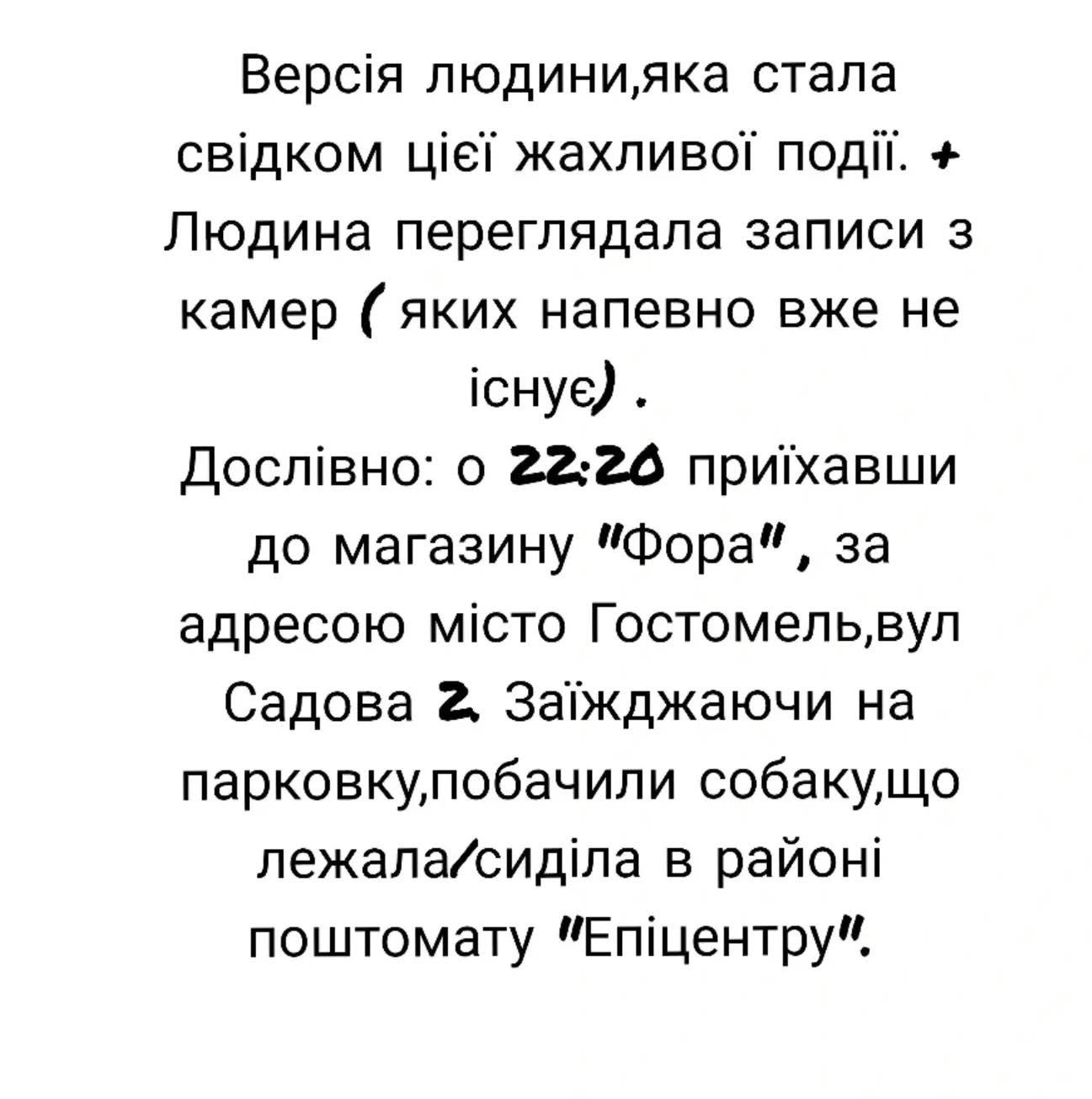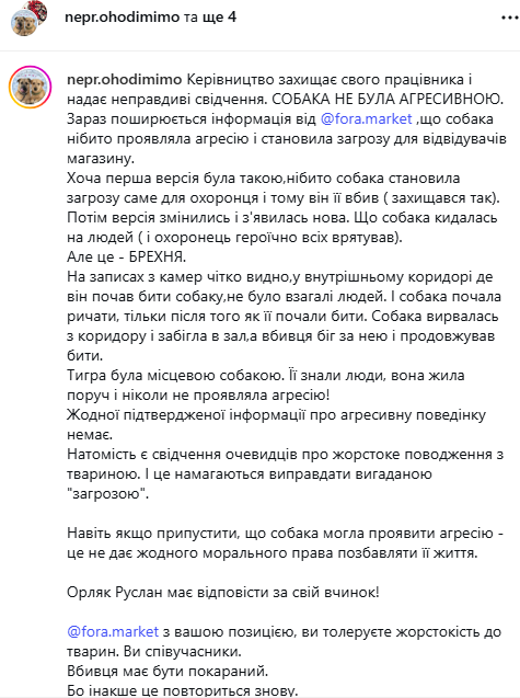"Але це брехня! На записах з камер чітко видно, що у внутрішньому коридорі, де він почав бити собаку, не було взагалі людей. І собака почала гарчати тільки після того, як її почали бити. Собака вирвалася з коридору і забігла у зал, а вбивця біг за нею і продовжував бити", — ідеться в повідомленні.