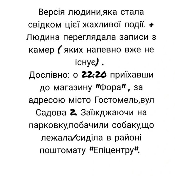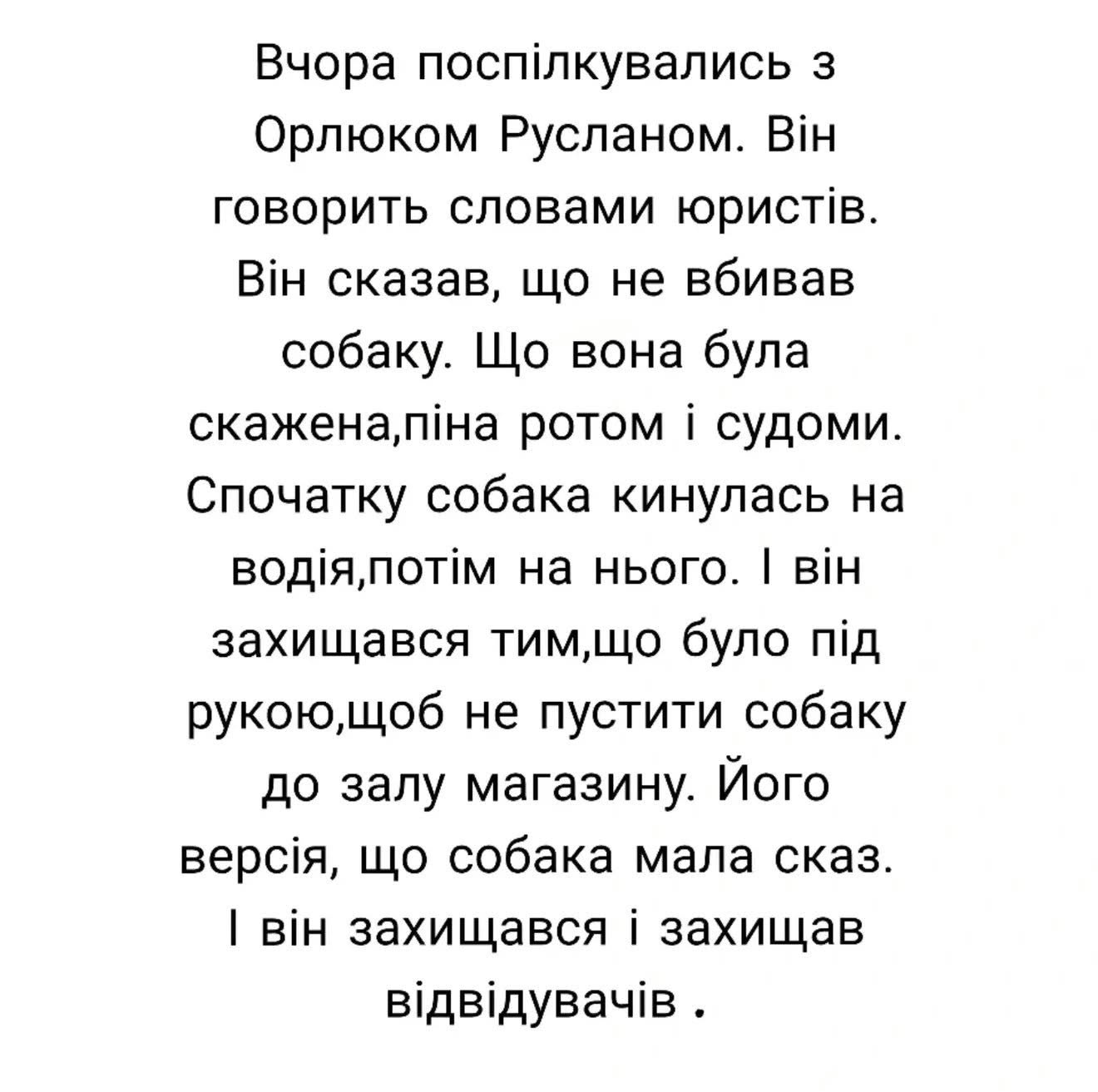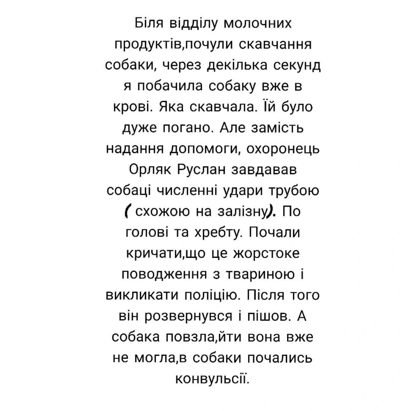 "Охоронець Руслан Орляк наносив численні удари палицею, схожою на металеву, по голові та хребту. Почали кричати, що це жорстоке поводження з тваринами, викликали поліцію. Після цього він розвернувся і пішов. А собака повзла. Йти вона уже не могла, у неї почалися конвульсії. Приблизно через 10 хвилин собака померла", — описують побачене клієнти магазину.