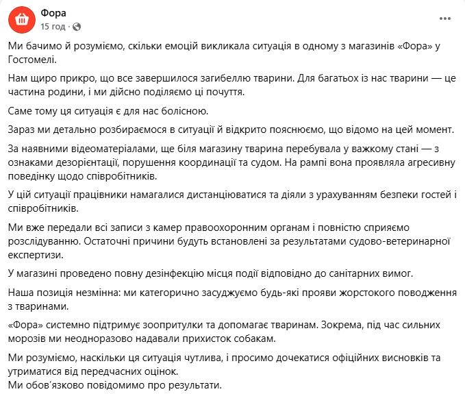 Напередодні на сторінці "Фори" в Instagram з'явилося пояснення того, що сталося, за версією супермаркету. Зокрема, у ньому йдеться про те, що адміністрація з розумінням ставиться до резонансу і щиро шкодує про загибель тварини.