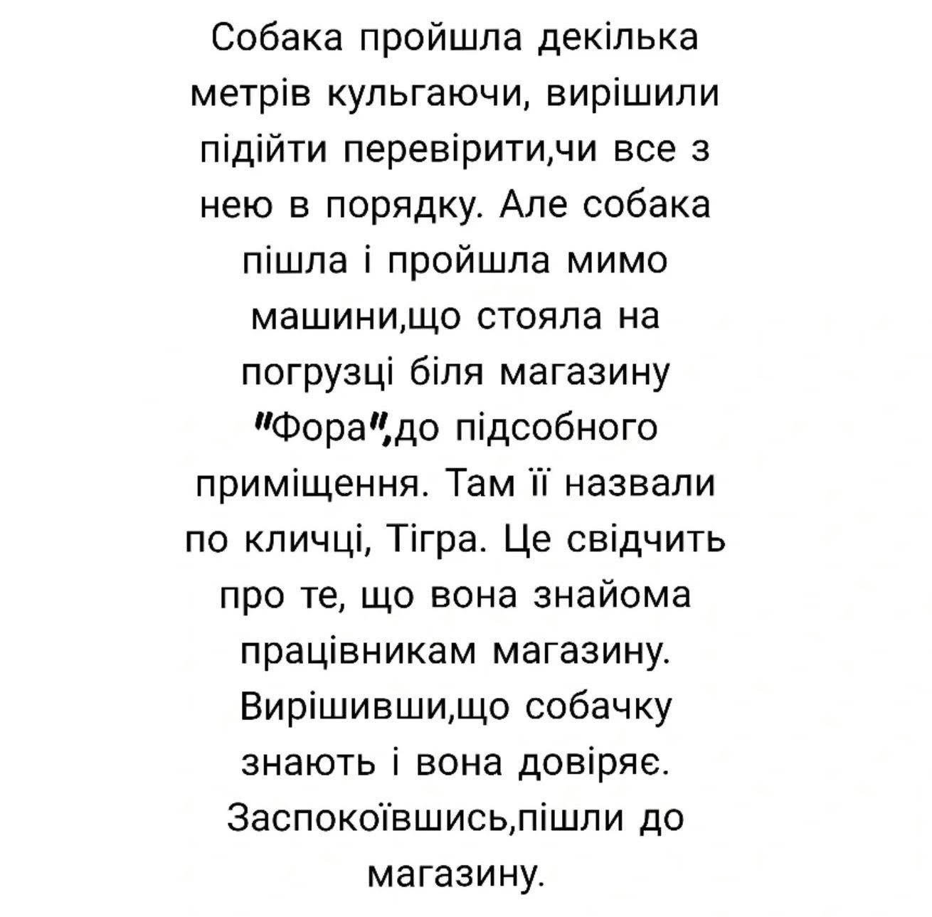 Очевидці, які вирішили простежити за Тигрою, заспокоїлися, і будучи впевненими, що з твариною все буде добре, пішли за покупками. Однак біля відділу молочних продуктів свідок почула скавучання собаки, а потім побачила Тигру всю в крові.