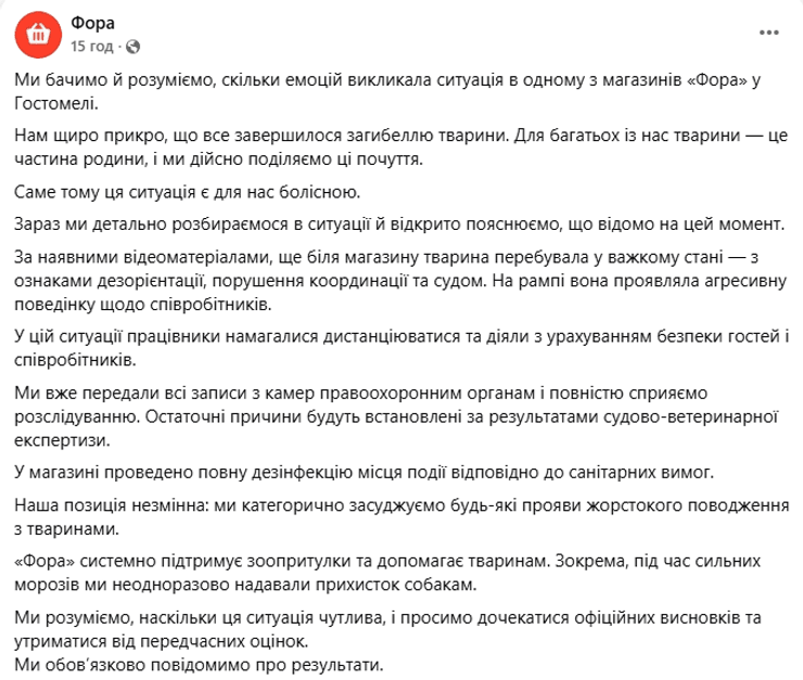 "Наша позиція незмінна: ми категорично засуджуємо будь-які прояви жорстокого поводження з тваринами. "Фора" системно підтримує зоопритулки та допомагає тваринам. Зокрема, під час сильних морозів ми неодноразово надавали притулок собакам. Ми розуміємо, наскільки ця ситуація є чутливою, і просимо дочекатися офіційних висновків та утриматись від передчасних оцінок", — запевнили у "Форі" та пообіцяли обов'язково повідомити результати.