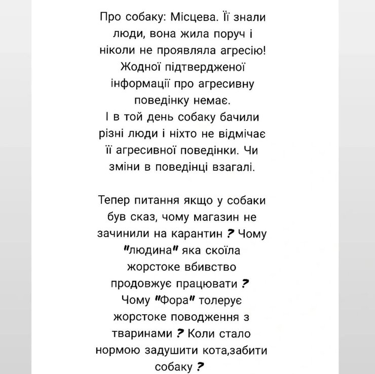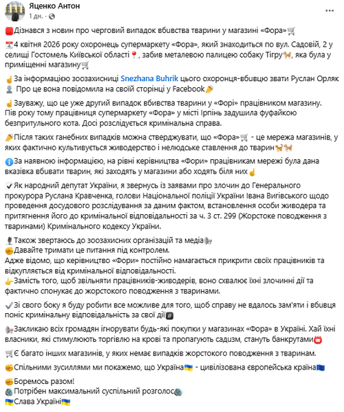 Народний депутат Антон Яценко констатує новий випадок загибелі тварини у "Форі" і пише, що, за наявною інформацією, на рівні керівництва "Фори" працівникам мережі була дана вказівка вбивати тварин, які заходять у магазини або ходять біля них.
