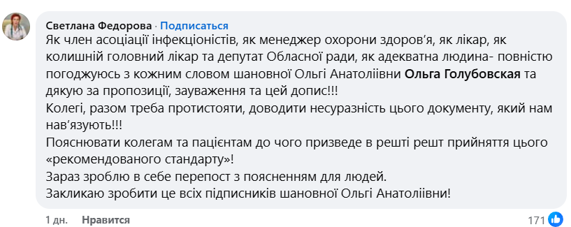 "Це надзвичайно важливий документ, мета якого, як завжди, обмежити ваш доступ до своєчасного лікування. Стандарт більшою мірою нагадує рекомендації, якими ми керуємося при визначенні необхідності переведення госпіталізації безпосередньо до відділення інтенсивної терапії та реанімації", — пише Голубовська.