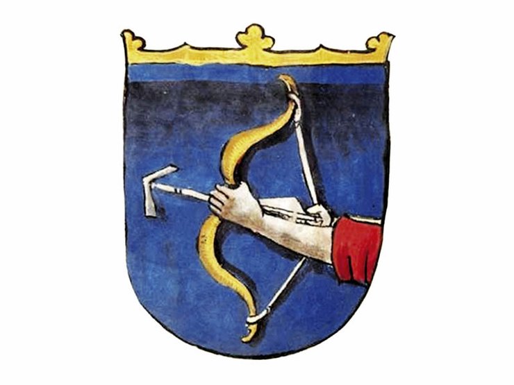 До появи Архангела Михаїла Київ мав інший, не менш промовистий символ. Один із найдавніших гербів зображував руку, що виходить із хмари та натягує лук зі стрілою. Лук на старому гербі Києва — це не випадкова декоративна деталь і не просто "стародавня зброя для краси". Для істориків це один із найдавніших міських символів столиці, який напряму пов’язаний із військовою роллю Києва як прикордонного й укріпленого центру. Найраніше відоме зображення такого знака пов’язують із гербовником Конрада Ґрюненберґа близько 1480 року, де в синьому полі руки в червоних рукавах натягують золотий лук зі стрілою; пізніше дуже схожий мотив бачимо й на київських міських печатках XVI століття.