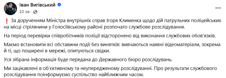 Своєю чергою очільник НПУ повідомив, що розпочато службове розслідування щодо дій патрульних поліцейських на місці стрілянини у Голосіївському районі.