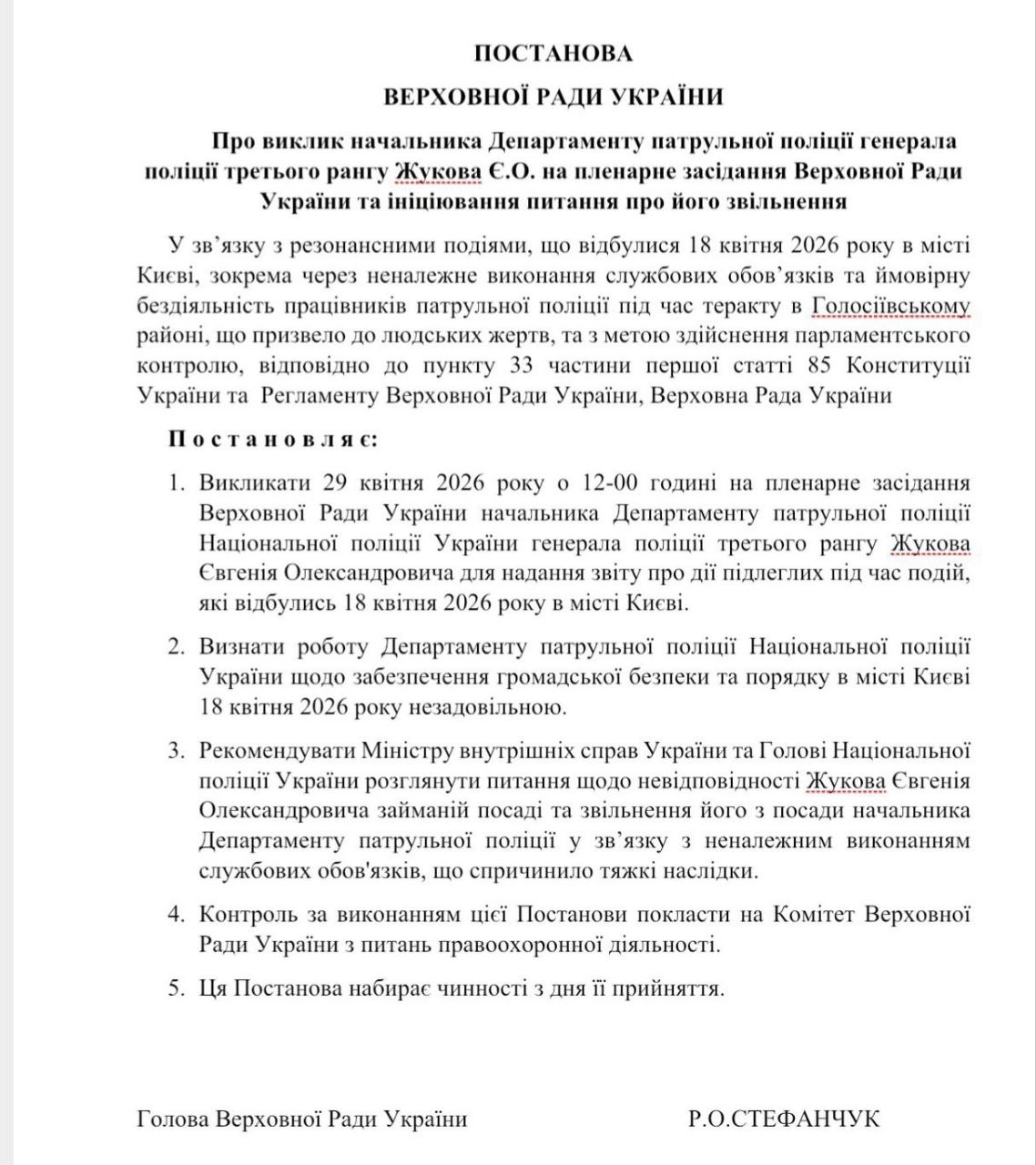 Через неналежне виконання службових обов'язків та ймовірну бездіяльність працівників патрульної поліції під час теракту в Голосіївському районі, що призвело до людських жертв, ВРУ збиралася визнати роботу Департаменту патрульної поліції Національної поліції України щодо забезпечення громадської безпеки та порядку в місті Києві 18 квітня 2026 року незадовільною.
