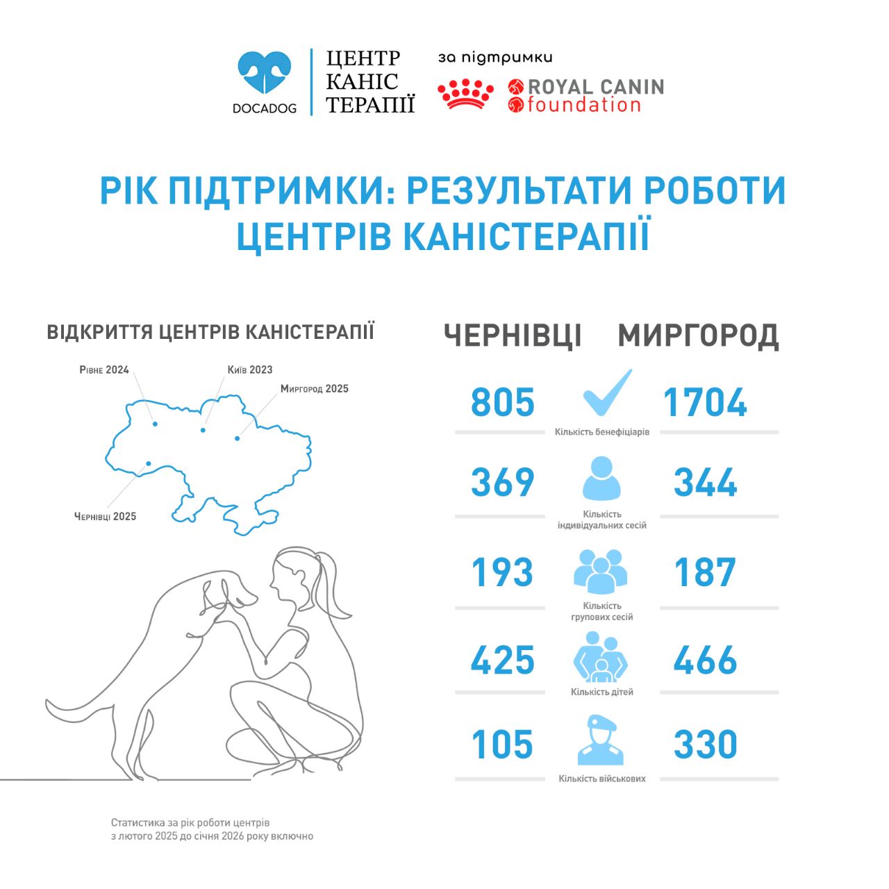 Центри каністерапії у Миргороді та Чернівцях за підтримки Royal Canin Foundation офіційно відкрилися у березні 2025 року, а працювали у тестовому режимі почали ще з лютого 2025 року. За перший рік центри прийняли понад 2500 відвідувачів, з них — близько 800 дітей та понад 400 військових. У двох центрах за рік провели майже 1100 сесій — як індивідуальних, так і групових.