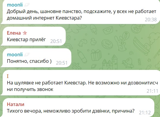 У чатах люди скаржаться, що на Шулявці, наприклад, наразі мобільний оператор не працює, і неможливо кудись зателефонувати або прийняти дзвінок. Також абоненти констатують, що не працює домашній інтернет від "Київстар".