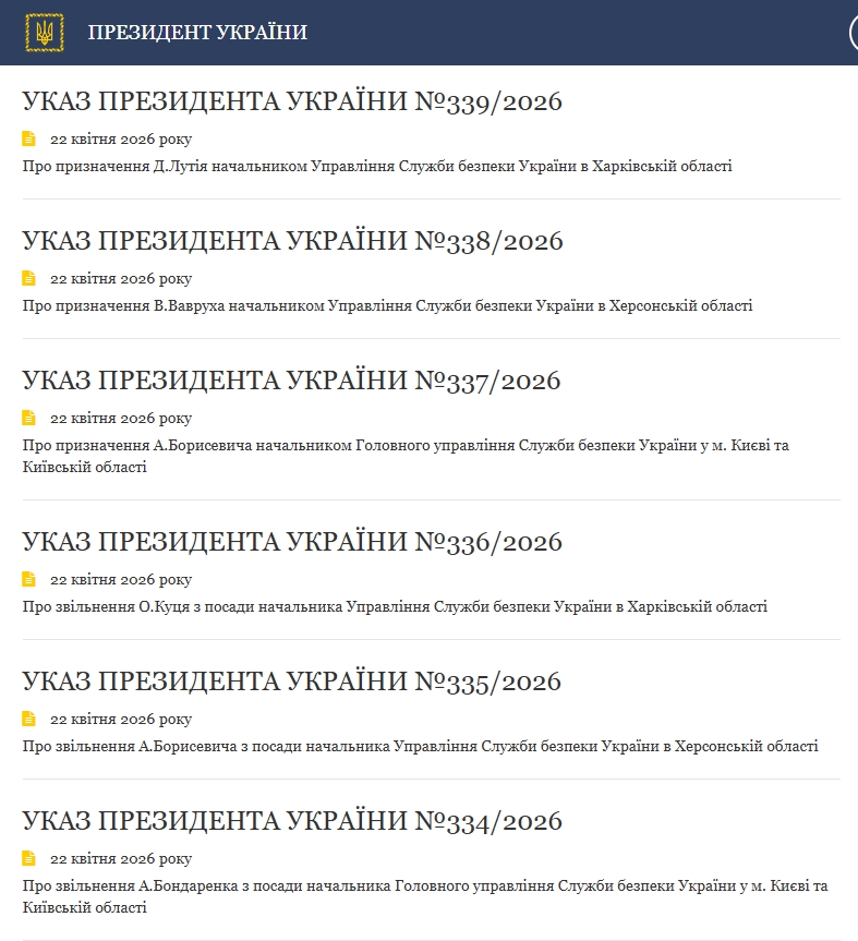 Тексти відповідних указів №№333/2026-339/2026 від 22 квітня опубліковано на сайті президента України в четвер, 22 квітня.