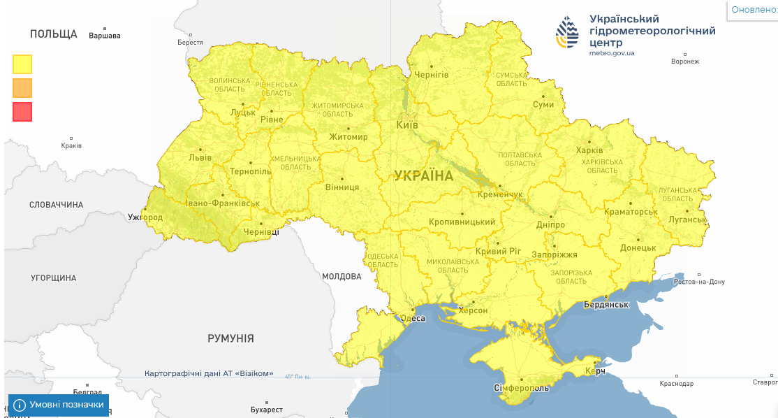 "Вдень 26 квітня у більшості південних, центральних, Харківській та Сумській областях грози, в окремих районах град та шквал 15-20 м/с; вдень 26 та 27 квітня в Україні пориви вітру 15-20 м/с (I рівень небезпечності, жовтий)", — зазначили в Укргодрометцентрі.