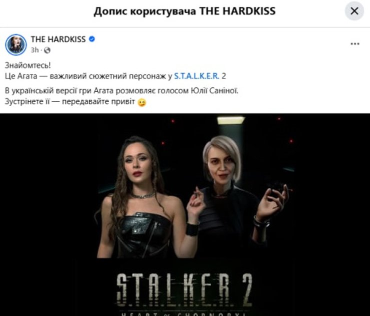 "Знайомтесь! Це Агата — важливий сюжетний персонаж у S.T.A.L.K.E.R. 2. В українській версії гри Агата розмовляє голосом Юлії Саніної. Зустрінете її — передавайте привіт", — йдеться в повідомленні.