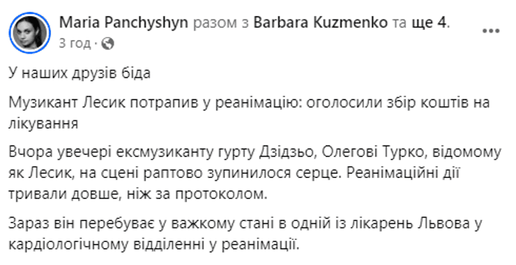 "Учора ввечері у ексмузиканта гурту DZIDZIO Олега Турко, відомого як Лесик, на сцені раптово зупинилося серце. Реанімаційні дії тривали довше за протокол. Наразі він перебуває у тяжкому стані в одній із лікарень Львова у кардіологічному відділенні реанімації", — повідомила вона.
