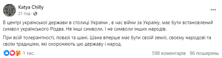 "У центрі української держави в столиці України, під час війни за Україну, має бути встановлений символ українського Різдва. Не інші символи. І не символи інших народів. За всієї толерантності, поваги і пошани. Повага насамперед має бути до своєї землі, до свого народу і до своїх традицій, які охороняють цю державу і народ", — написала Катя Чилі.