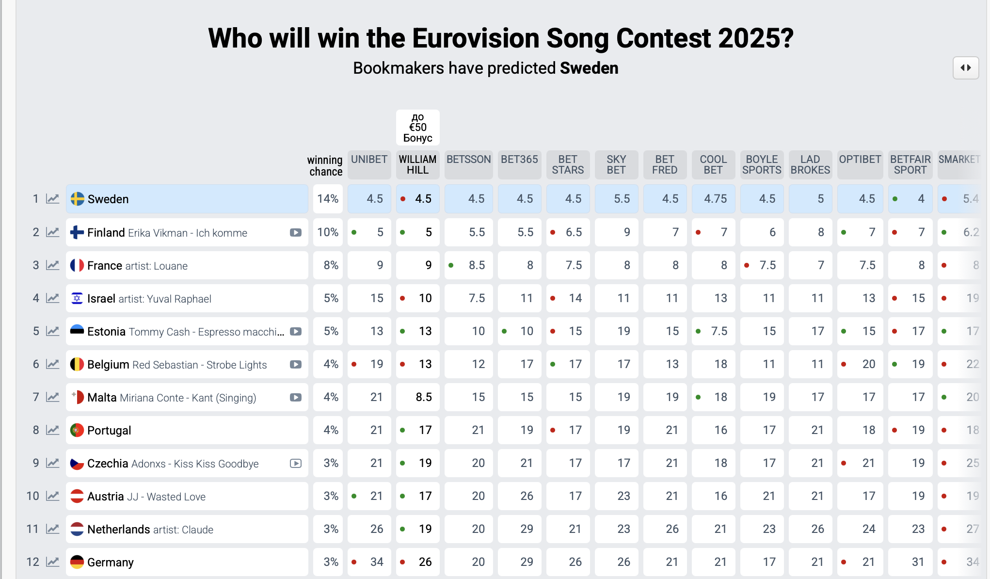 Друге місце рейтингу букмекерів наразі у Фінляндії. До трійки також увійшла Франція, а за нею йдуть Ізраїль та Естонія.