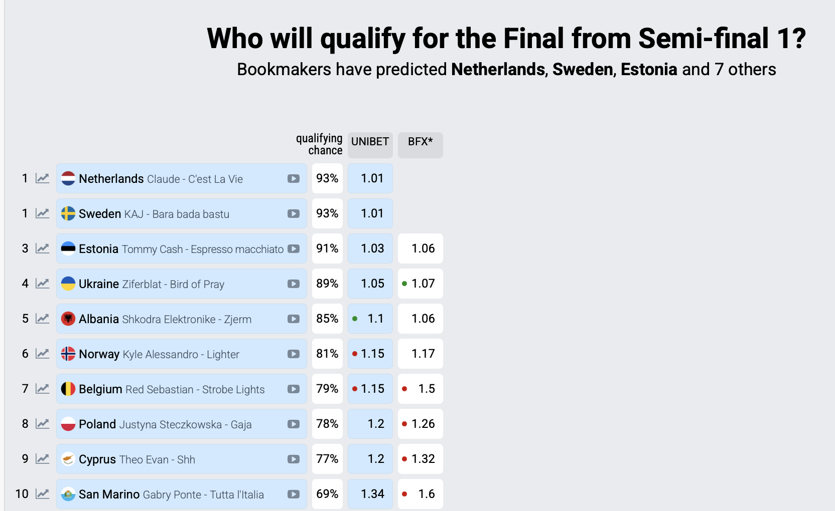 Цікаво, що Нідерланди 27 березня були четвертими, а Україна була сьомою. Гурт Ziferblat за кілька тижнів представить у Базелі пісню Bird of Pray.