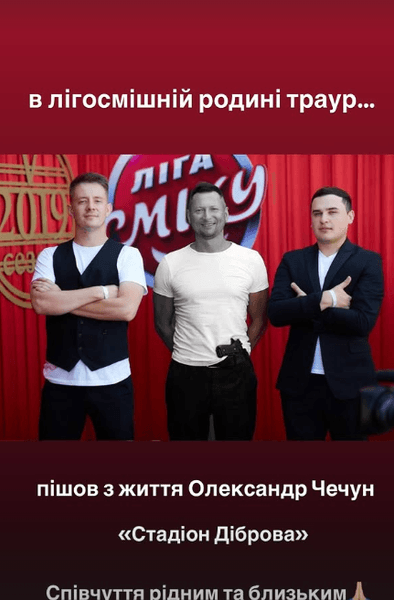 "У лігосмішній сім'ї траур. Пішов із життя Олександр Чечун "Стадіон Діброва". Співчуття рідним і близьким", — ідеться в повідомленні, опублікованому в stories.