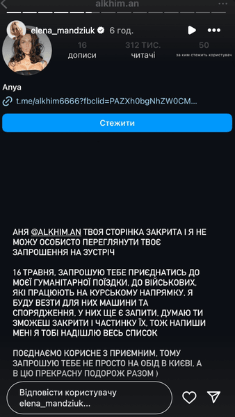 "Я запропонувала Олені зустрітися зі мною в п'ятницю в Україні. Але Олена запропонувала мені поїхати з нею 16 травня на Курський напрямок відвезти допомогу військовими. Я, звичайно ж, приймаю її запрошення. Ми навіть можемо, Олено, з тобою поїхати в одній машині. І зараз я вже пишу на твій Telegram, щоб ти написала список, що потрібно хлопцям купити. Тому що я з перших днів війни допомагала, допомагаю і буду продовжувати допомагати", – зазначила блогерка.