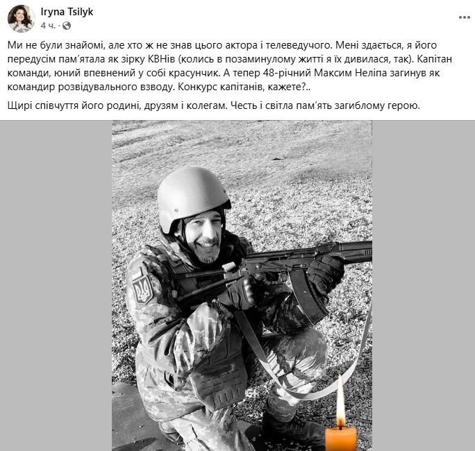 "Мені здається, я його насамперед пам'ятала як зірку КВК (колись у позаминулому житті я їх дивилася, так). Капітан команди, юний упевнений у собі красунчик. А тепер 48-річний Максим Неліпа загинув як командир розвідувального взводу. Конкурс капітанів, кажете? Щирі співчуття його родині, друзям і колегам. Честь і світла пам'ять загиблому герою", — йдеться в її публікації в Facebook.