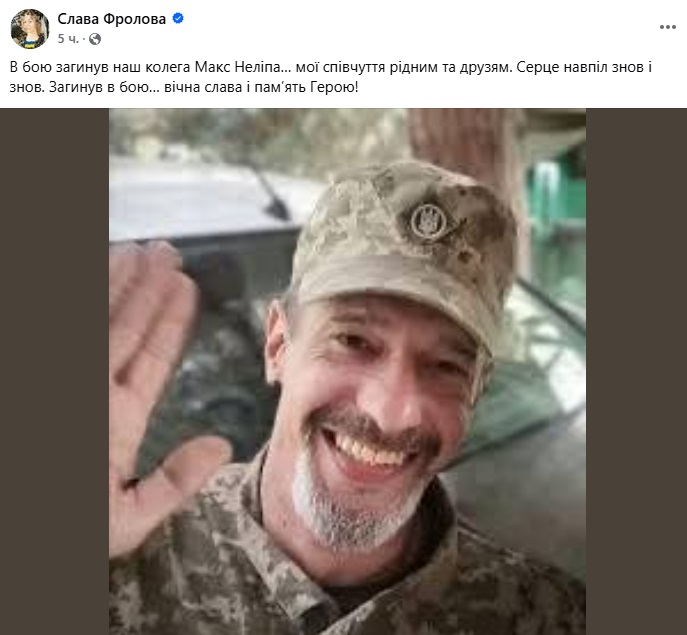 "У бою загинув наш колега Макс Неліпа… мої співчуття рідним і друзям. Серце навпіл знову і знову. Загинув у бою… вічна слава і пам'ять Герою!", — написала теле- і радіоведуча Слава Фролова.