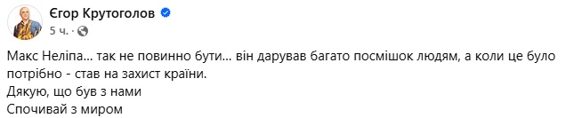 "Макс Неліпа… так не повинно бути… він дарував багато посмішок людям, а коли це було потрібно — став на захист країни. Дякую, що був з нами".