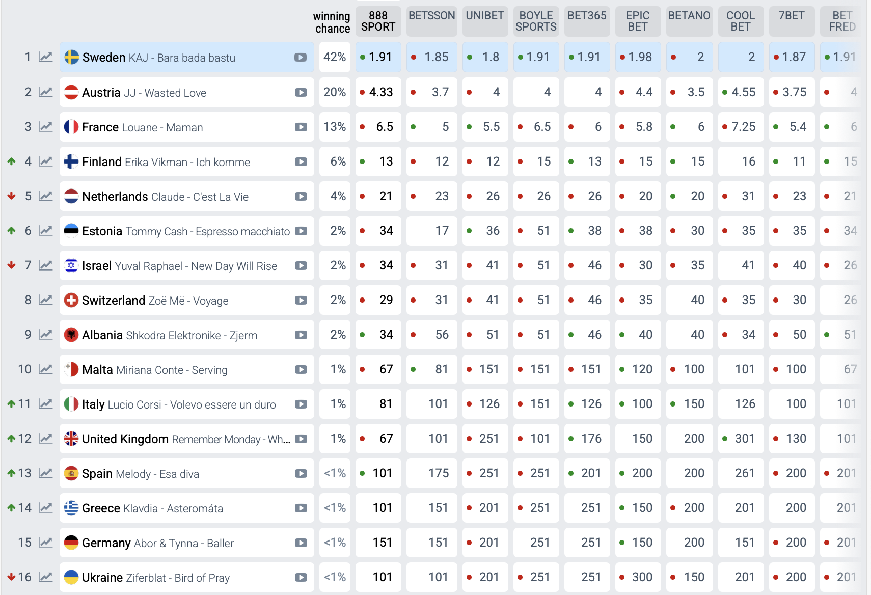 Уже сьогодні, 17 травня, стане відоме імʼя чи імена переможця "Євробачення-2025". У швейцарському Базелі виступлять представники 26 країн. Український гурт Ziferblat вийде на сцену під номером 7. Наразі букмекери прогнозують українцям 16-те місце. Найбільше шансів на перемогу у Швеції. Також дуже ймовірною виглядає перемога Австрії, Франції, Фінляндії, Нідерландів, Естонії, Ізраїлю, Швейцарії тощо.