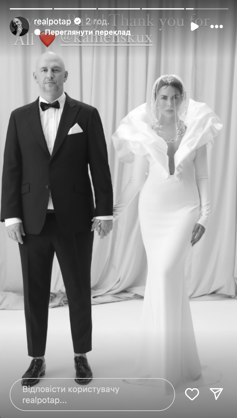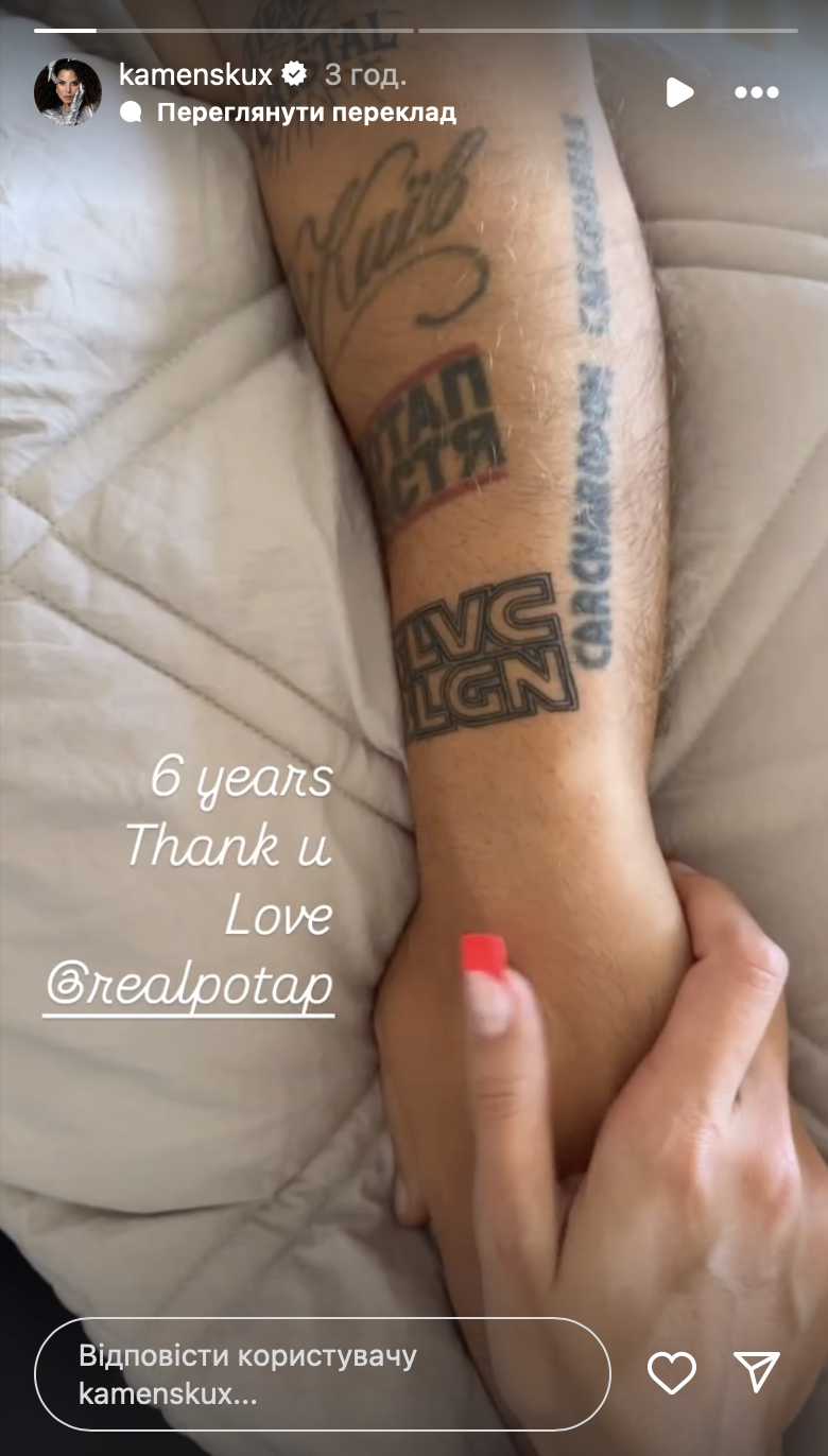 Каменських опублікувала в Instagram лаконічну сторіс: на відео з'являються лише їхні з Потапом руки. Артистка погладжує зап'ястя коханого, а на руці продюсера можна побачити татуювання "Київ", "Потап і Настя".
