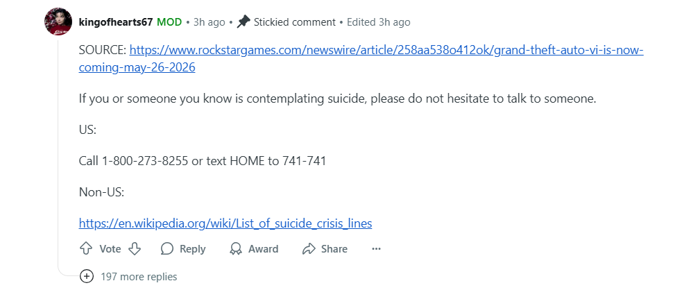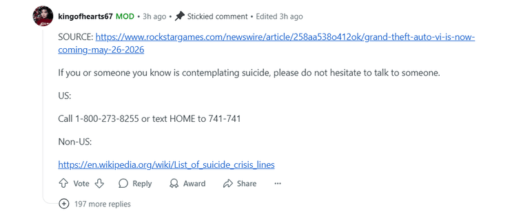Фанати важко сприйняли відтермінування дати виходу популярної гри GTA 6. У Reddit-треді щодо перенесення релізу навіть закріпили номер гарячої лінії для запобігання самогубствам.