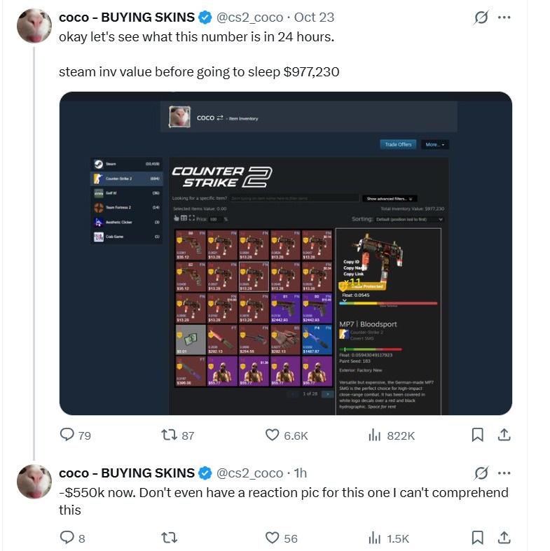 Оновлення Valve для CS2 від 23 жовтня спричинило найбільший обвал ринку скінів в історії. Професійні гравці в CS2, інвестори, стримери та інші повідомили про колосальні збитки, що обчислюються шестизначними сумами. У Китаї, імовірно, одна людина наклала на себе руки.