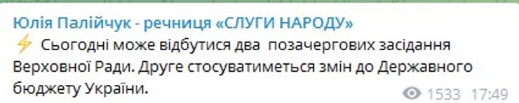За інформацією прессекретарки партії "Слуга народу" Юлії Палійчук, на одному розглянуть запровадження режиму надзвичайного стану, а на другому — зміни до держбюджету з перерозподілом коштів на військові потреби.