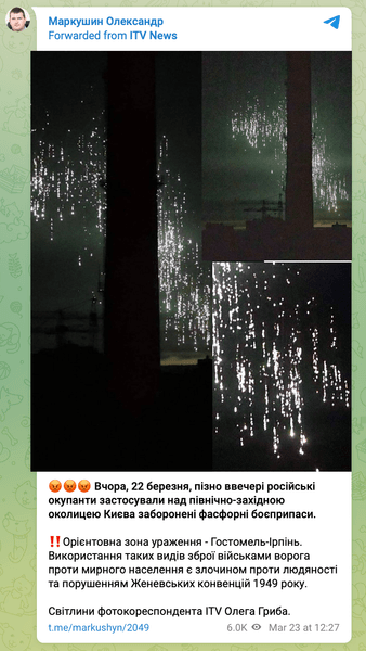 Увечері, 22 березня, російські війська обстріляли територію Київської області забороненими Женевською конвенцією фосфорними снарядами. Про це йдеться у публікації телеграм-каналу ITV News, яку на своїй сторінці розповсюдив мер Ірпеня Олександр Маркушин.