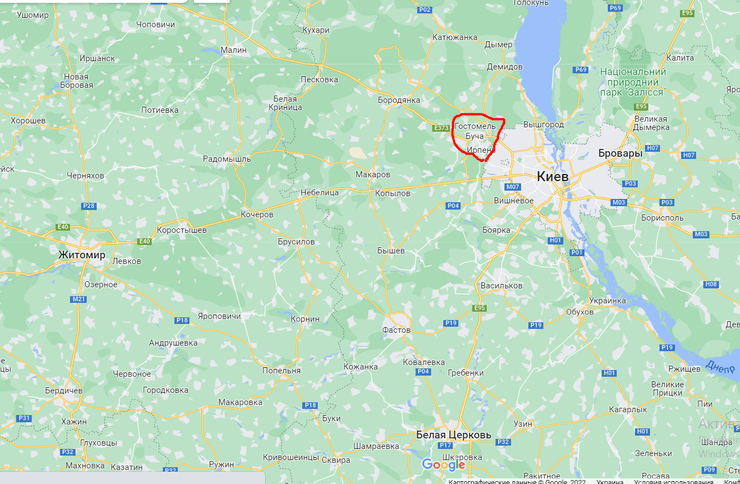 Збройні сили України взяли в кільце міста Ірпінь, Бучу та Гостомель Київської області. Ситуація в регіоні залишається важкою: Макарівська, Бучанська, Ірпінська, Дмитрівська громади залишаються під постійним обстрілом російських військових. Крім того, у Дмитрівській громаді спостерігається пересування ворога та обстріли навколишніх сіл. У ніч проти 23 березня ворожі війська обстріляли село Шпитьки, що призвело до пожежі, а також постійно точаться бої на Житомирській трасі. Про це написала Бучанська міська рада у Facebook.