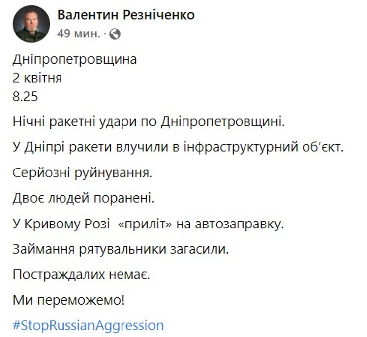 Крім Полтавської області, яка донедавна вважалася відносно безпечним регіоном, атаки зазнала Дніпропетровщина. За інформацією голови ДОВА Валерія Резніченка, ворожі ракети потрапили в інфраструктурний об'єкт, спровокувавши серйозні руйнування. Поранено двох громадян. У Кривому Розі окупанти влучили в автозаправку. Наразі вогонь ліквідований. Обійшлося без постраждалих. Пізніше чиновник дописав, що вночі ППО збили над Дніпропетровською областю чотири ракети та один безпілотник.