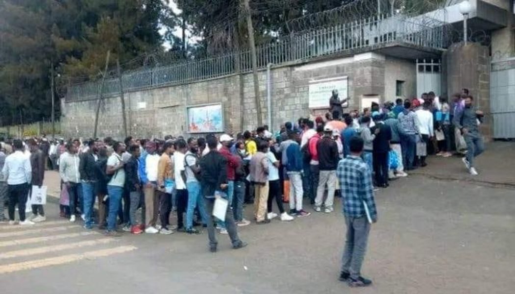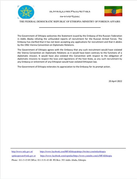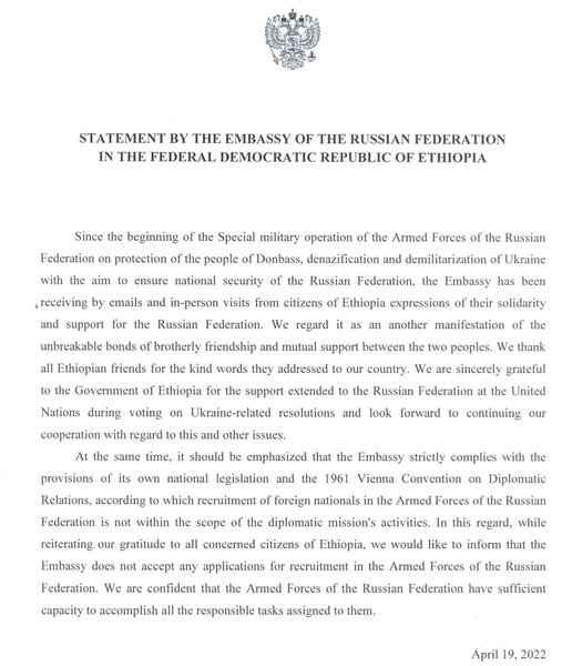 Журналісти Reuters 19 квітня побачили кілька сотень чоловіків. Охоронці посольства РФ в Ефіопії записували їхні імена та вимагали доказу проходження військової служби. Далі з посольства вийшла людина і заявила, що в Росії "поки що достатньо сил". Через перекладача чоловікам сказали, що за потреби з ними зв'яжуться.