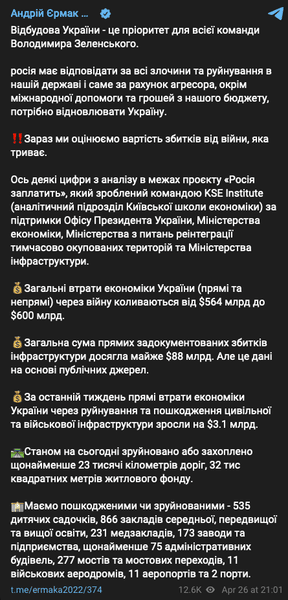 "Загальні втрати економіки України (прямі та непрямі) склали від $564 млрд до $600 млрд. Загальна сума прямої задокументованої шкоди інфраструктури досягла $88 млрд. Тільки за останній тиждень прямі втрати економіки України через руйнування зросли на $3,1 млрд", — уточнив Єрмак