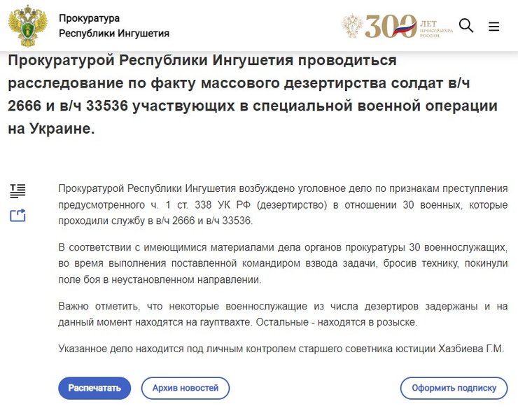 Варто зазначити, що в Мережі також було виявлено ресурс під назвою "Прокуратура Республіки Інгушетія". У колонці сайту знаходиться повідомлення, в якому йдеться про дезертирство 30 солдатів, які беруть участь у так званій "спеціальній військовій операції в Україні".