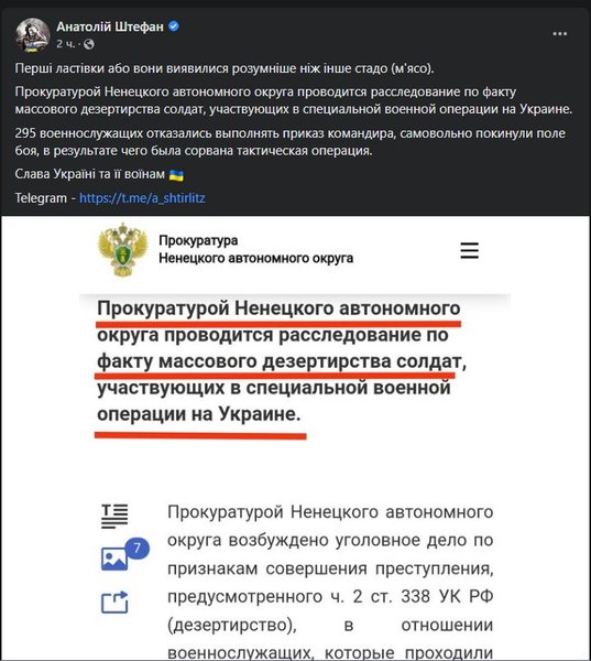 Видання пише, що згідно з матеріалами слідства, 295 російських військовослужбовців відмовилися виконувати наказ командира та втекли з поля бою. У зв'язку з цим порушено кримінальну справу за фактом дезертирства згідно з ч. 2 ст. 338 КК Російської Федерації щодо військовослужбовців, які проходили службу у військових частинах Ненецького автономного округу.