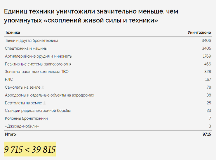 "Закони арифметики зобов'язували Конашенкова відняти два вертольоти від загальних втрат українців і замінити шістьма. Результат мав скласти 122 одиниці. Військовим дуже не хотілося знижувати цифру, так що зробити віднімання вони забули і прозвітували про 124 знищені одиниці за весь період", — говориться матеріал.