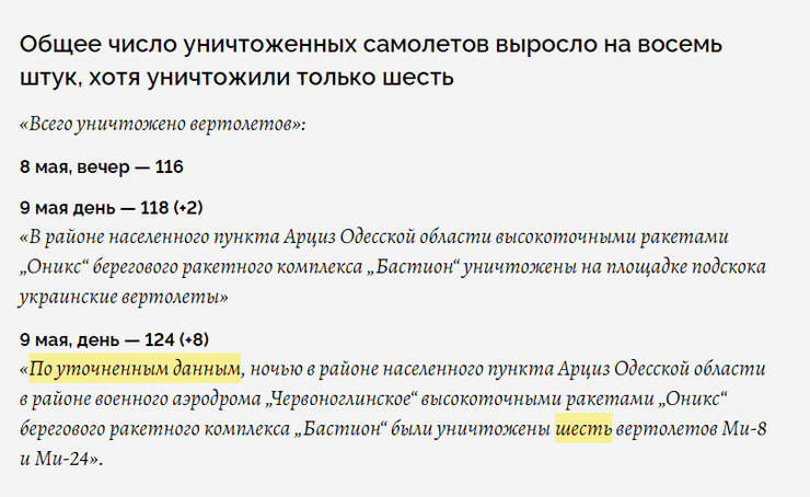 9 травня речник прорахувався з вертольотами. Вдень він заявив про знищення з початку війни 118 українських гелікоптерів — на 2 більше, ніж у попередній день. Увечері Міноборони уточнило інформацію — розбито 6 гелікоптерів, а не 2.