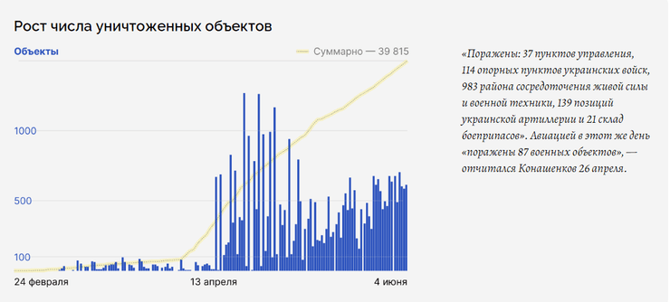"Справжній потік повідомлень про втрати українців у Конашенкова почався з 13 квітня. Це дивно, тому що всього за два тижні до того (30 березня) було оголошено про "планове перегрупування військ", тобто відступ з-під Києва, з того часу на фронтах не відбувалося значних змін. Але Конашенков почав звітувати не про десятки, а про сотні знищених об'єктів української військової інфраструктури", — навели приклад фахівці.