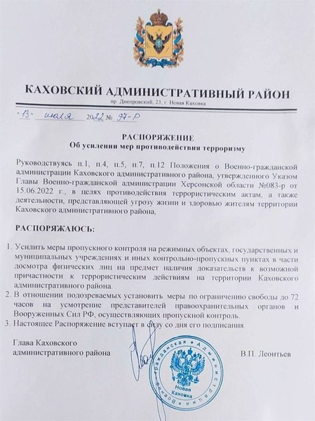 Інший колаборант Володимир Леонтьєв посилює пропускний контроль на території Каховського району. Окупанти отримали право на обшуки, затримання та обмеження свобод людей щодо розгляду окупантів. Також місцеві жителі розповсюджують між собою інформацію, що охочі виїхати в окупований Крим мають 72 години. Після цього ЗС РФ закриють проїзд.